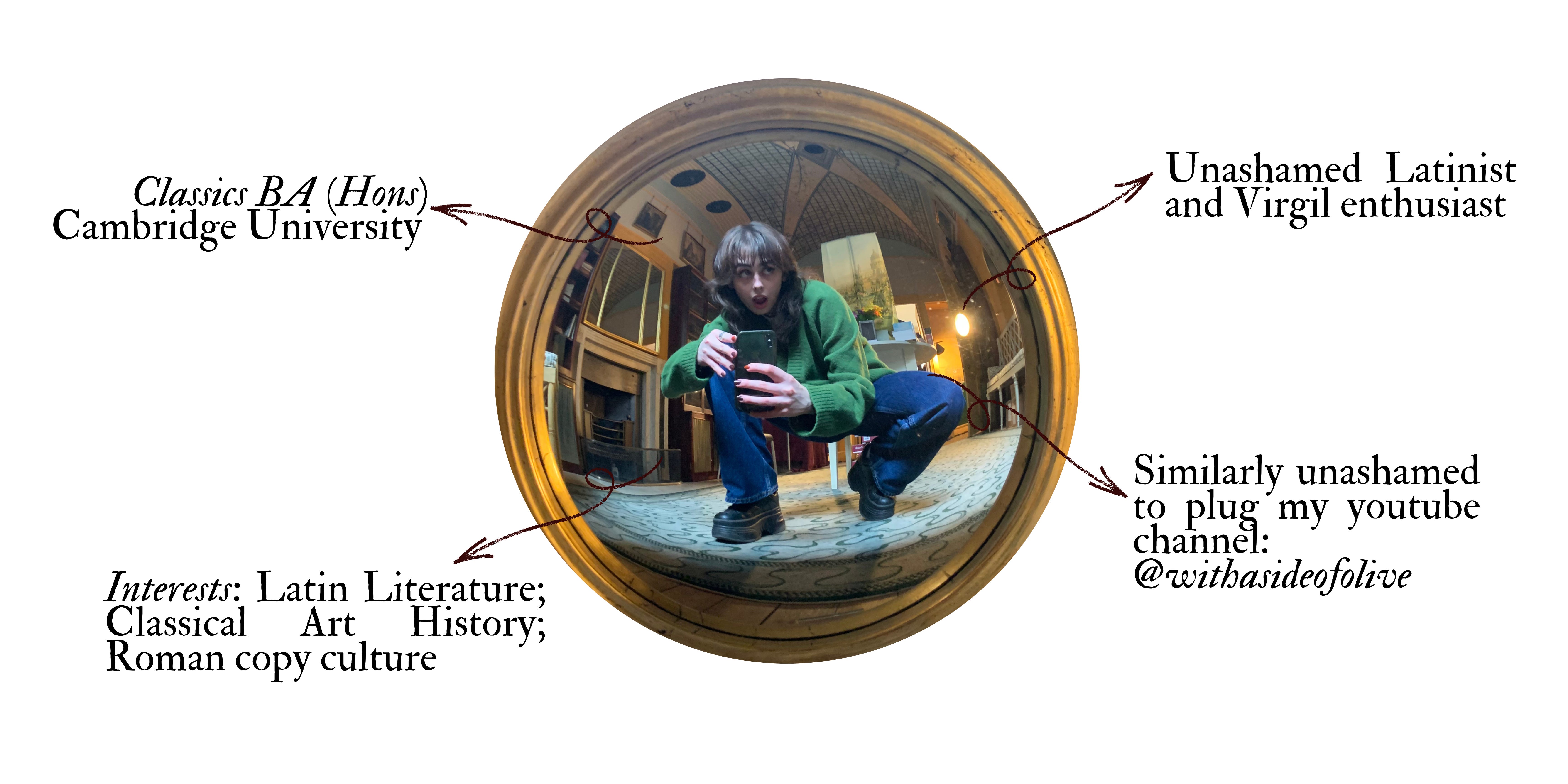 Salve! I’m Olive, a third-year at Cambridge University reading Classics. A subject perhaps both familiar and faintly esoteric to the discerning Substack reader, Classics is the ultimate magpie discipline: literature, art, archaeology, philosophy, language—all things ancient claim my fascination. Though this field is not without its challenges: I must still endure the perpetual low-level horror that is Ancient Greek translation (if anyone can be convinced, Latin is far more intriguing).